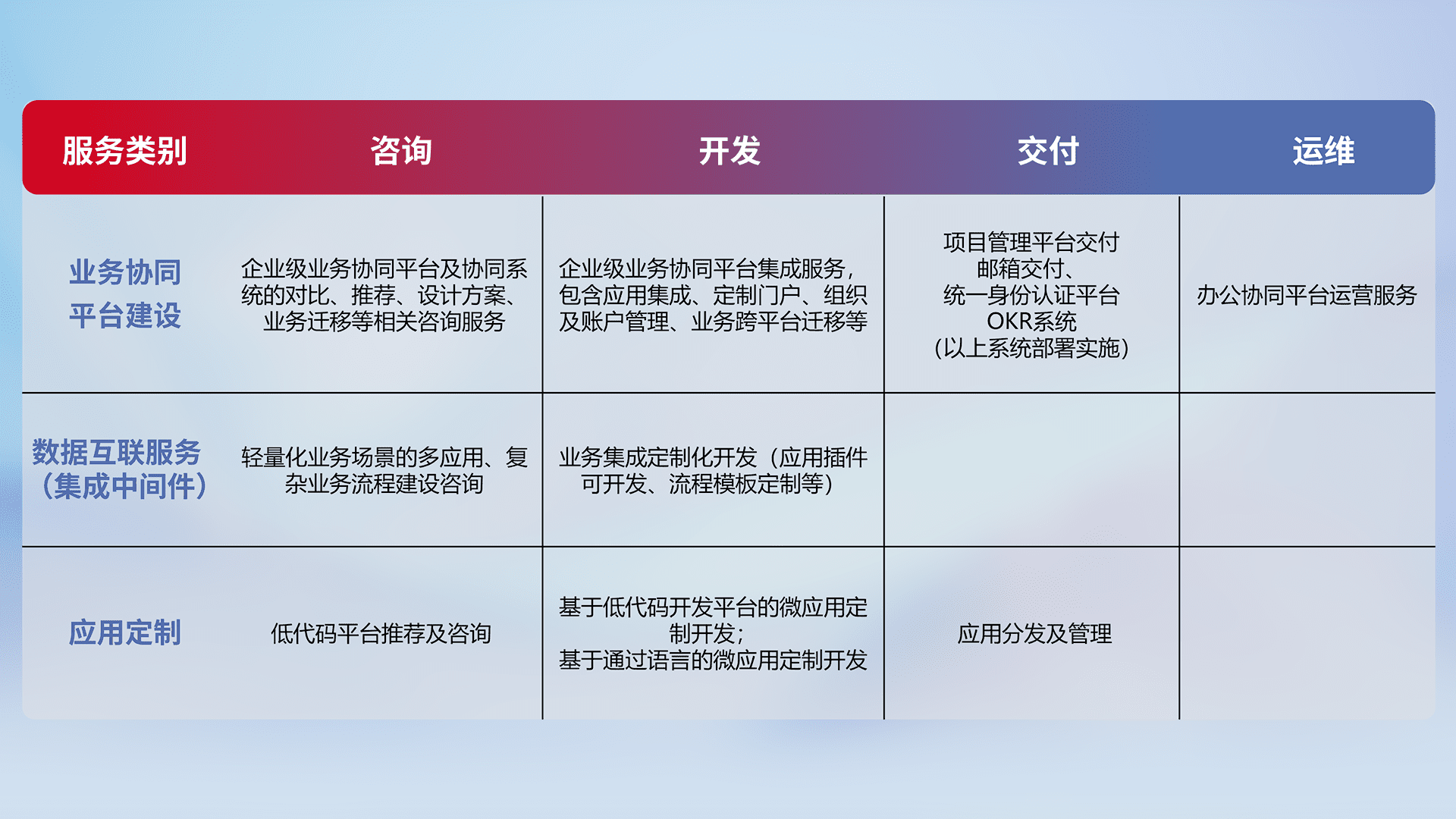 针对钉钉、、、企微、、、、IDaas等平台级产品提供产品的规划、、方案、、、交付、、、、定制化开发等服务,,,实现如统一协同办公、、、、智能客户服务、、、、混合会议管理、、、、智能数据查询、、、、等业务场景,,实现数字化转型。。。。